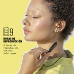 Hasta 9 horas de batería. Tecnología de carga rápida (2 horas). Resistente al sudor y al agua (clasificación IPX4). Micrófono y controles de 3 botones. Fabricado con materiales sustentables. Cable de 99% poliéster reciclado. Embalaje 100% de fibra de papel reciclable.