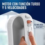 • Motor de 400 watts que ofrece 5 velocidades, y hasta cuenta con un botón de potencia adicional con la función de Turbo que permite aumentar la velocidad para manejar masas espesas
