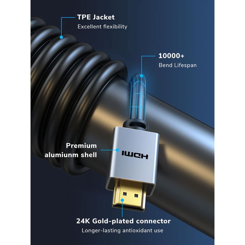 Los conectores HDMI están chapados en oro de 24K, mejorando la conductividad y resistencia a la oxidación para una conexión duradera. La cubierta exterior de PVC flexible protege contra dobleces, torsiones y desgaste por uso frecuente.