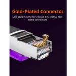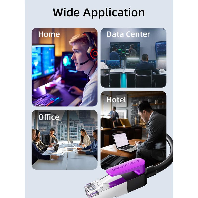 Compatible con estándares Ethernet CAT8, CAT7, CAT6A y CAT6, funcionando con routers, switches, módems y dispositivos de red que soporten estas categorías.