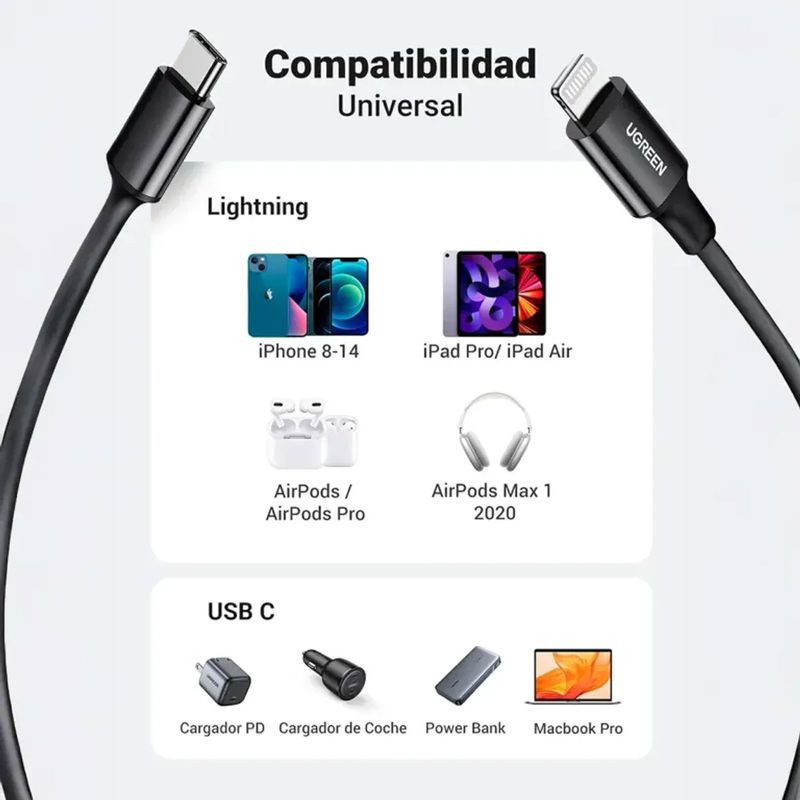 El cable UGREEN USB-C a Lightning permite carga rápida y transferencia de datos confiable entre dispositivos Apple y fuentes USB-C. Con 1 metro de longitud y conectores de alta calidad, ofrece durabilidad y rendimiento estable para uso diario.