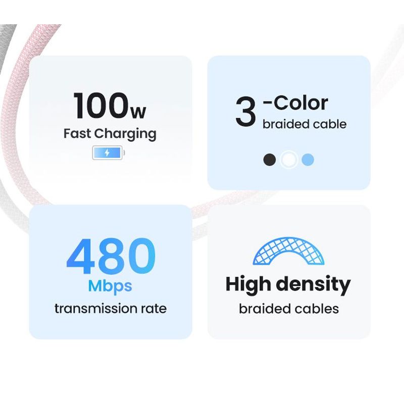 El cable UGREEN USB-C trenzado permite carga rápida y transferencia de datos eficiente entre dispositivos USB-C, soportando hasta 100W de potencia y 5A de corriente. Su diseño trenzado garantiza durabilidad y resistencia al desgaste en el uso diario. CARGA RÁPIDA PD Compatible con Power Delivery (PD) hasta 100W y 5A, optimiza la entrega de energía según el dispositivo conectado, asegurando carga rápida y segura para smartphones, tablets y laptops. DISEÑO TRANZADO DURADERO La cubierta trenzada protege el cable de torsiones, doblado y desgaste, prolongando su vida útil y manteniendo la estética incluso con uso intensivo. COMPATIBILIDAD AMPLIA Compatible con dispositivos USB-C que soporten carga PD y transferencia de datos, incluyendo smartphones, tablets, laptops y accesorios USB-C. IMAGEN REFERENCIAL (El empaquetado del producto puede tener variaciones)