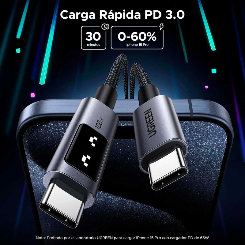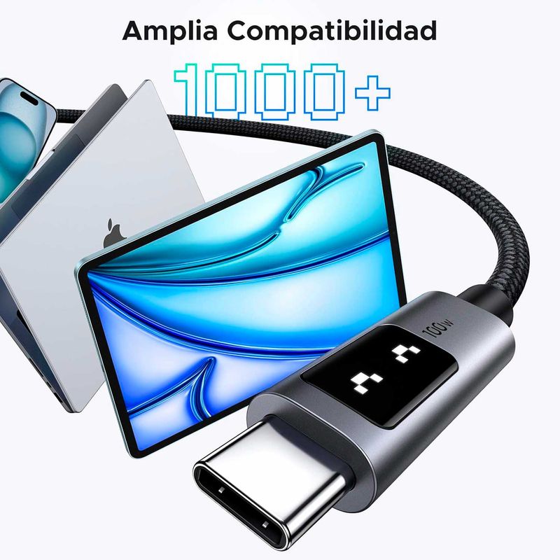 Pantalla LED inteligente: Este cable tipo C de 100 W con un simpático emoticono LED te muestra cómo se carga tu dispositivo. Es práctico y divertido de usar.