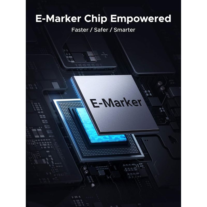 Incorpora un chip E-Mark integrado que permite la comunicación inteligente entre el cable y los dispositivos conectados, identificando automáticamente la capacidad de carga y datos disponible. Esto asegura una transmisión de energía optimizada y protege los equipos contra fluctuaciones o sobrecargas.