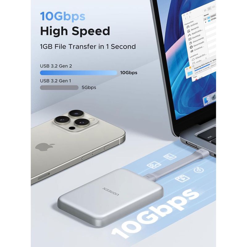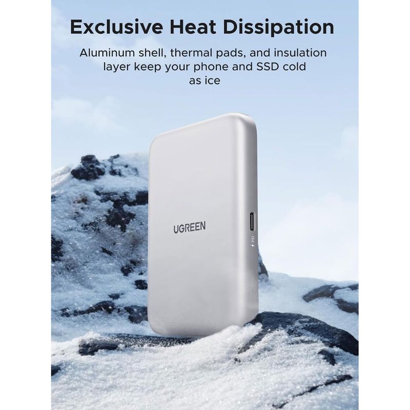 La carcasa UGREEN D619 ofrece una solución rápida y segura para convertir tu SSD NVMe M.2 en una unidad externa portátil. Su sistema magnético facilita la instalación sin herramientas, permitiendo intercambiar SSDs en segundos.