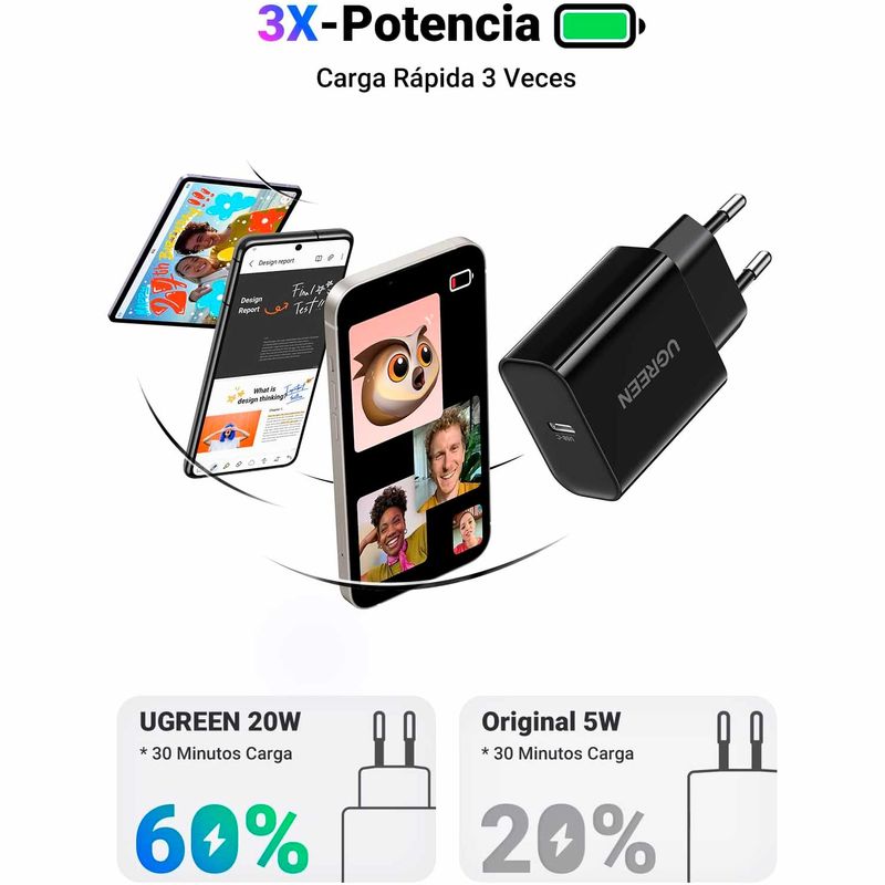 20W Carga Rápida para Todos iPhones: Cargador tipo c carga rapida con chip GaN avanzado combina un diseño compacto con un alto rendimiento. Es perfecto para tu iPhone: la función de carga rápida de 20 W puede cargar tu iPhone 16 de 0% a 60% en 30 minutos, 3 veces más rápido que un cargador normal