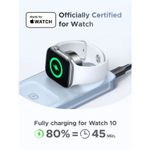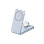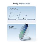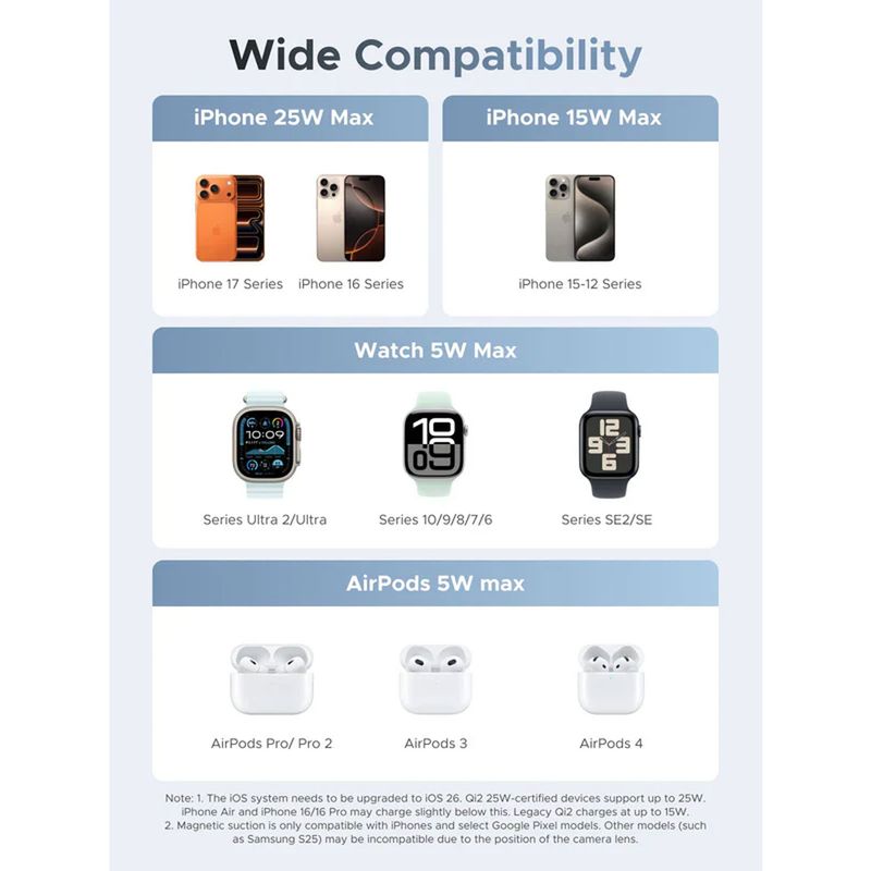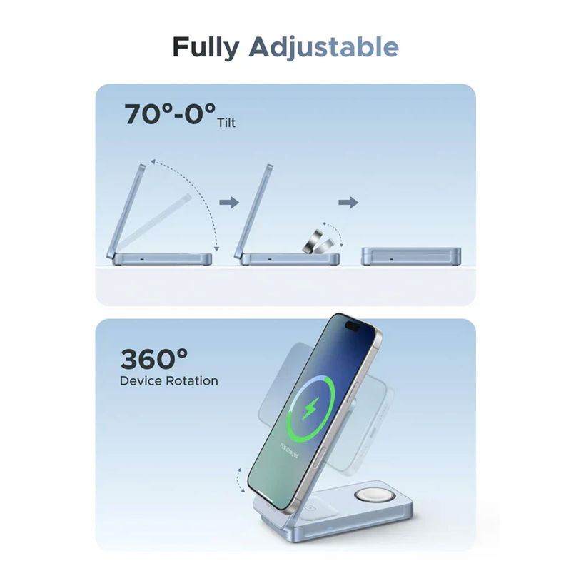 Los imanes integrados son compatibles con smartphones que soportan MagSafe o anillos magnéticos adhesivos, manteniendo el dispositivo firme durante la carga. La base para reloj es ajustable y compatible con la mayoría de modelos de smartwatch.