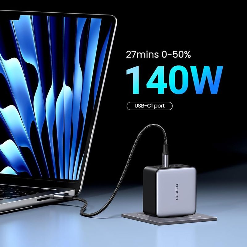 Carga rápida PD 3.1 de 140 W: el puerto USB C1 ofrece 140 W cuando se usa solo, cargando MacBook Pro de 16 pulgadas de 0% a 50% en solo 27 minutos, requiere un cable de carga magsafe de 140 W