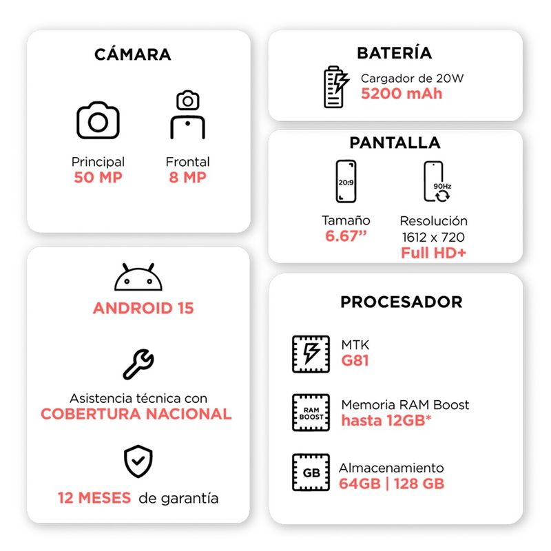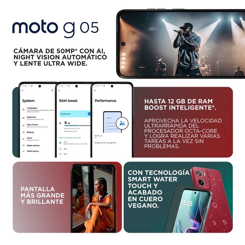 El Motorola G05 cuenta con 128 GB de almacenamiento interno y 4 GB de RAM, expandibles hasta 12 GB con RAM Boost. Su sistema operativo Android te ofrece una experiencia fluida y eficiente. Con una cámara frontal de 8 MP, tus selfies serán de alta calidad. Incluye cargador y cable USB, para que puedas empezar a usarlo desde el primer momento. La conectividad 4G te permitirá navegar a alta velocidad.