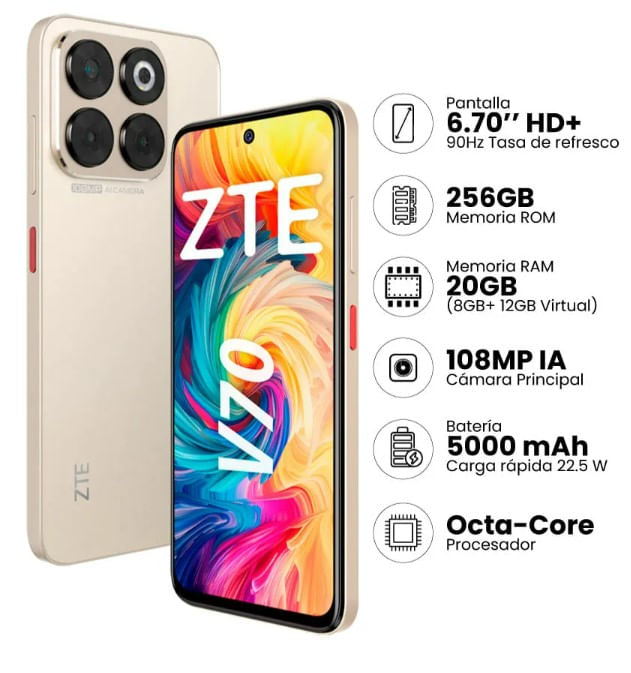 Descubre el equilibrio perfecto entre estilo y potencia con el ZTE Blade V70 . Captura cada momento con una resolución asombrosa gracias a su cámara principal de 108 MP impulsada por IA y disfruta de una experiencia visual ultra fluida en su pantalla de 6.7 pulgadas con 120 Hz. Con 256 GB de memoria y 8 GB de RAM, el rendimiento y el espacio nunca serán un problema. Es el smartphone ideal para quienes buscan tecnología de vanguardia y fotografía de alta definición.