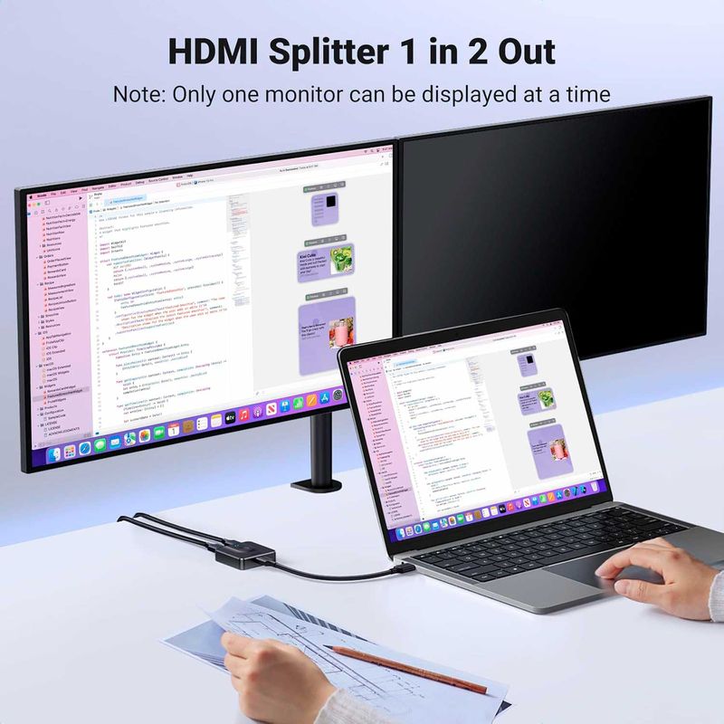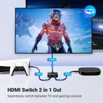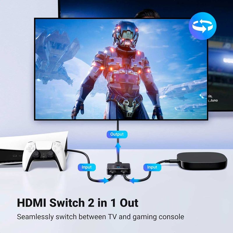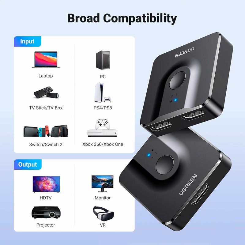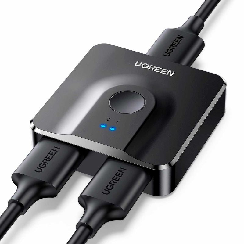 El conmutador divisor HDMI UGREEN ofrece 2 entradas HDMI para conectar tus dispositivos a un monitor HDMI. Con un solo botón, cambia fácilmente entre dos dispositivos, sin necesidad de conectarlos ni desconectarlos.