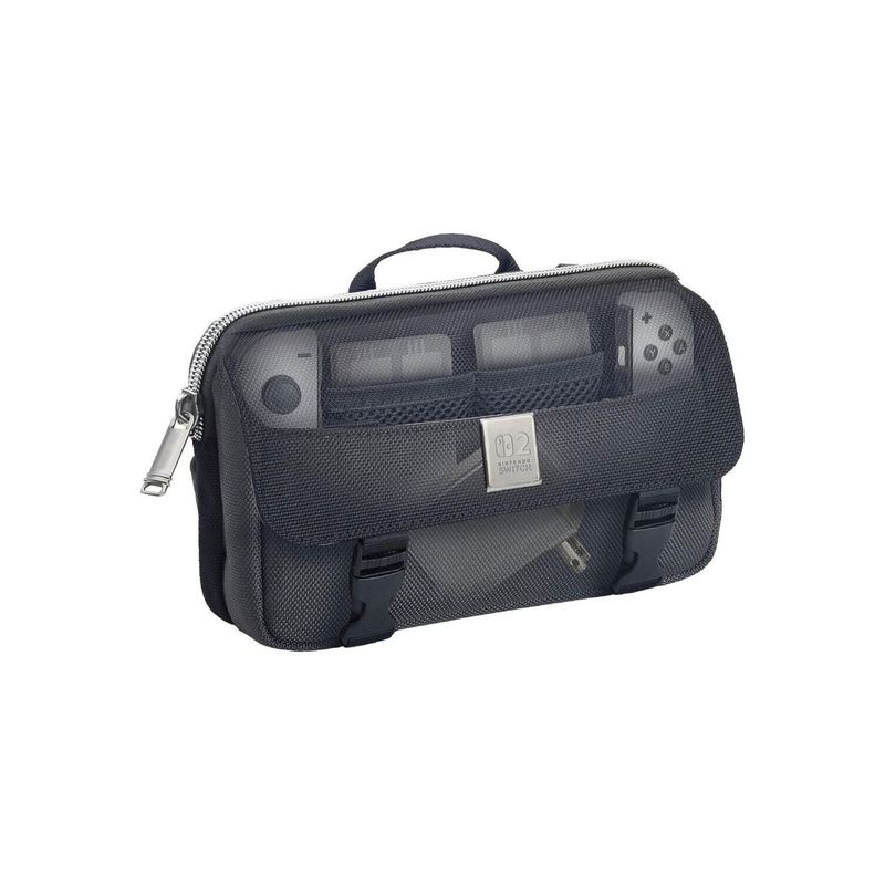 Producto oficial licenciado para Nintendo, compatible con Switch 2, Switch OLED y Switch. Su bolsillo trasero acolchado puede guardar la consola sin los Joy-Cons acoplados, mientras que los accesorios como cargador, cables, correas y cartuchos tienen espacio dedicado.