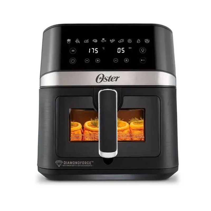 6 Litros de capacidad: permite cocinar un pollo de hasta 2.7Kg., Recubrimiento Oster® DiamondForce: Hasta 15 veces más fácil de limpiar., Panel de Control Digital., Ventana y luz Interna para mejorar la visibilidad., 10 Programas Automáticos que añaden conveniencia y facilidad al cocinar:., Papas fritas, alitas, aves, carne, vegetales, pescado/mariscos, hornear, postre, deshidratar, calentar., Cocina hasta con 99% menos aceite., Sistema de manejo de cables: ., Mantiene el cable ordenado y listo para usar .