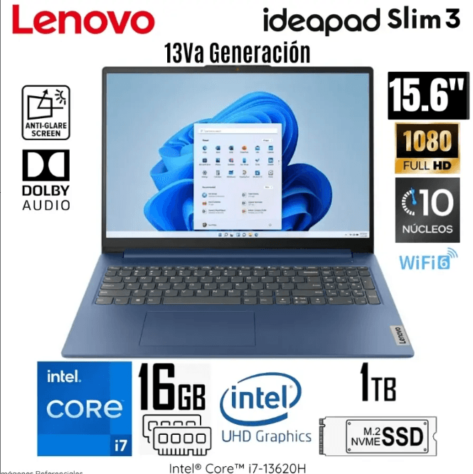 TecnologíaLAPTOP LENOVO SLIM 3 INTEL CORE i7-13620H, 16GB , 1TBSSD, 15.6" FHD, WINDOWS 11, 15IRH8 COLOR:ABYSS BLUE