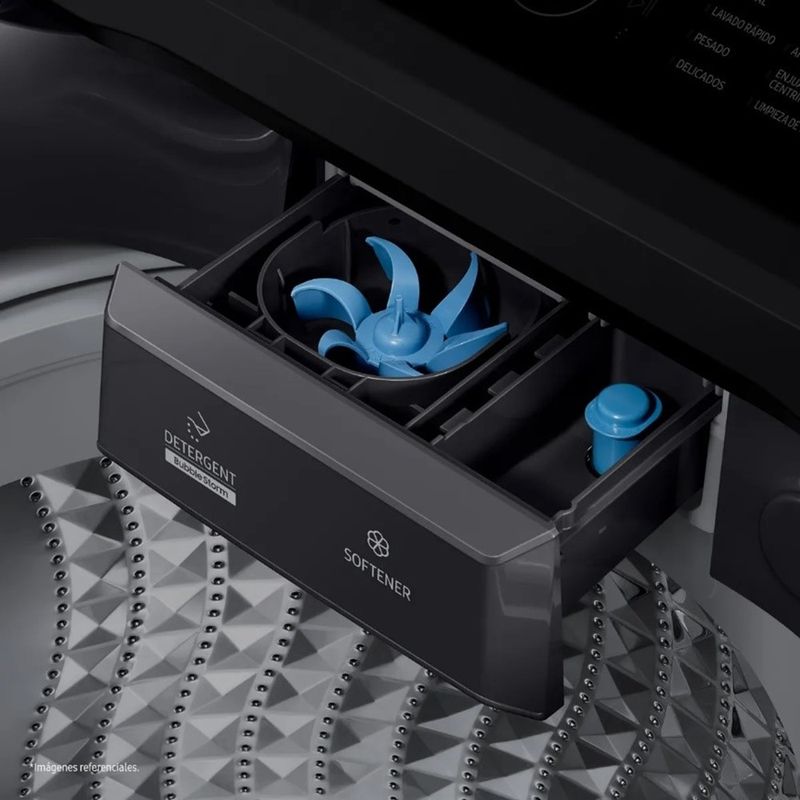 Desde el primer uso, se percibe como una aliada pensada para hacerte la vida más fácil, sin sacrificar resultados ni consumo responsable. Este modelo de lavadora Samsung de carga superior incorpora la reconocida tecnología EcoBubble, que permite generar burbujas de detergente antes de que el agua entre en contacto con la ropa.