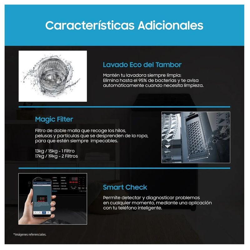 Desde el primer contacto transmite solidez, modernidad y la confianza de un electrodoméstico diseñado para durar. Esta lavadora Samsung de carga superior incorpora la avanzada tecnología EcoBubble, que convierte el detergente en burbujas antes de entrar en contacto con la ropa, logrando un proceso de lavado mucho más efectivo.