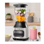 Capacidad del vaso: 1.5 litros (vaso de vidrio refractario), Material del vaso: Vidrio resistente a choques térmicos, Velocidades: 6 velocidades + función pulso, Cuchillas: Acero inoxidable, 4 aspas resistentes, Tipo de control: Perilla giratoria, Tapa: Plástica con boquilla vertedora y tapón dosificador, Color: Negro con detalles plateados, Funciones principales: Licuar, triturar hielo, batidos, jugos, salsas, Dimensiones aproximadas: 20 cm (ancho) x 25 cm (profundidad) x 38 cm (alto), Peso: 3.5 kg aprox., Accesorios incluidos: Vaso, tapa con dosificador, base con motor