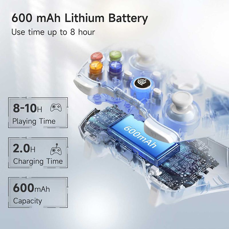 Batería de larga duración: la batería de litio mejorada de 600 mAh del controlador de juego 9013 Pro puede proporcionar hasta 8-10 horas de tiempo de juego, por lo que no necesita preocuparse por el agotamiento de la batería durante juegos intensos; La carga solo se puede completar en 2-3 horas.