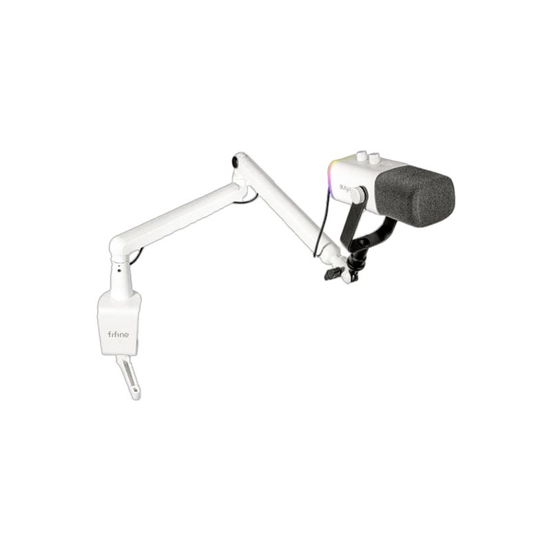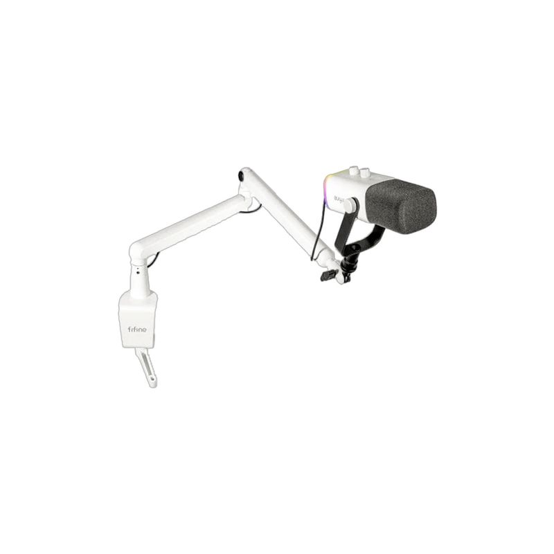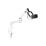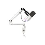 Su acabado en color blanco combina estilo y practicidad. El micrófono está diseñado para colocarse fácilmente en escritorios, estaciones de streaming o estudios pequeños, aportando estética sin sacrificar funcionalidad.