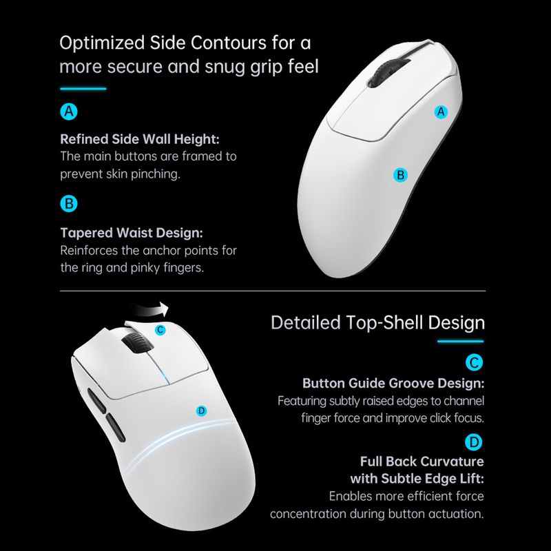 Su forma está diseñada para adaptarse a la palma de la mano en estilo "claw" o "palm", ofreciendo comodidad durante largas sesiones de juego. Los laterales con agarre texturizado brindan mayor control en movimientos rápidos.