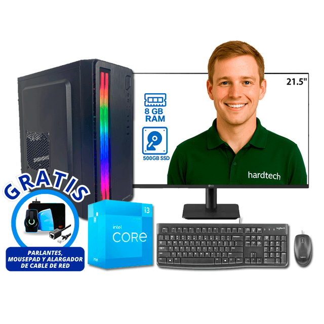 Tu primer paso hacia el rendimiento confiable. Con procesador Intel Core i3 de 12ª generación, 8GB de RAM y SSD de 500GB, esta PC es ideal para oficina, hogar o estudio. Viene con monitor de 21", teclado y mouse incluidos. Además, no te pierdas los accesorios gratis que incluye tu compra. Incluye 1 año de garantía.