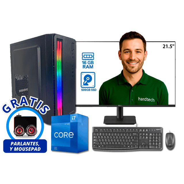Rinde al máximo con esta torre Intel Core i7 de 12ª generación. Ideal para usuarios profesionales, con 16GB de RAM y SSD de 500GB. Disfruta de un monitor de 21", teclado, mouse y audífonos incluidos. Perfecta para quienes necesitan velocidad y confiabilidad todo el día. Incluye 1 año de garantía.