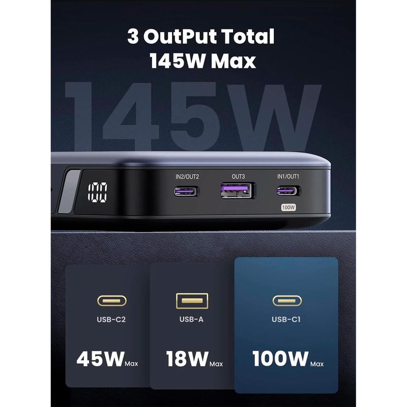 Carga rápida máxima de 145 W: Gracias a las últimas tecnologías PD 3.0 y QC 3.0, esta batería externa para portátil alcanza una velocidad de carga ultrarrápida: ¡145 W de potencia total (USB C1 100 W + USB C2 45 W, USB C1 140 W)! La MacBook Pro 2022 se carga al 50 % en solo 30 minutos. Con 3 puertos USB (2 USB C y 1 USB A), esta batería externa USB C permite cargar rápidamente 3 dispositivos simultáneamente. ¡Se acabaron las colas de carga!