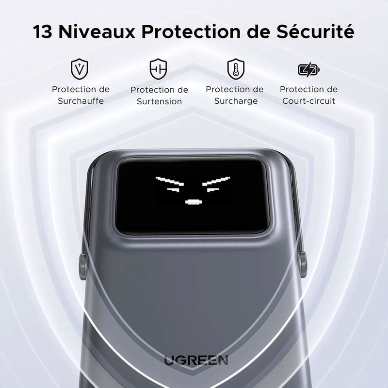 Incluye un puerto USB-C que soporta Power Delivery para carga rápida cableada de hasta 20W, permitiendo recargar el power bank o dispositivos conectados a alta velocidad. Ajusta automáticamente la potencia para proteger la batería.