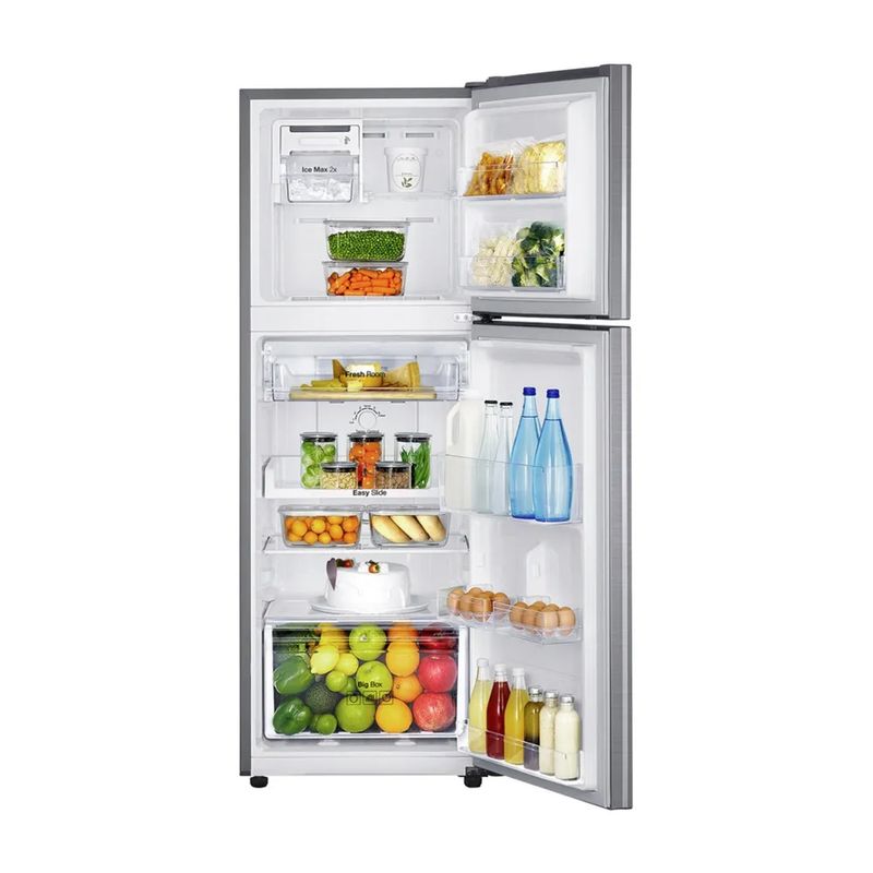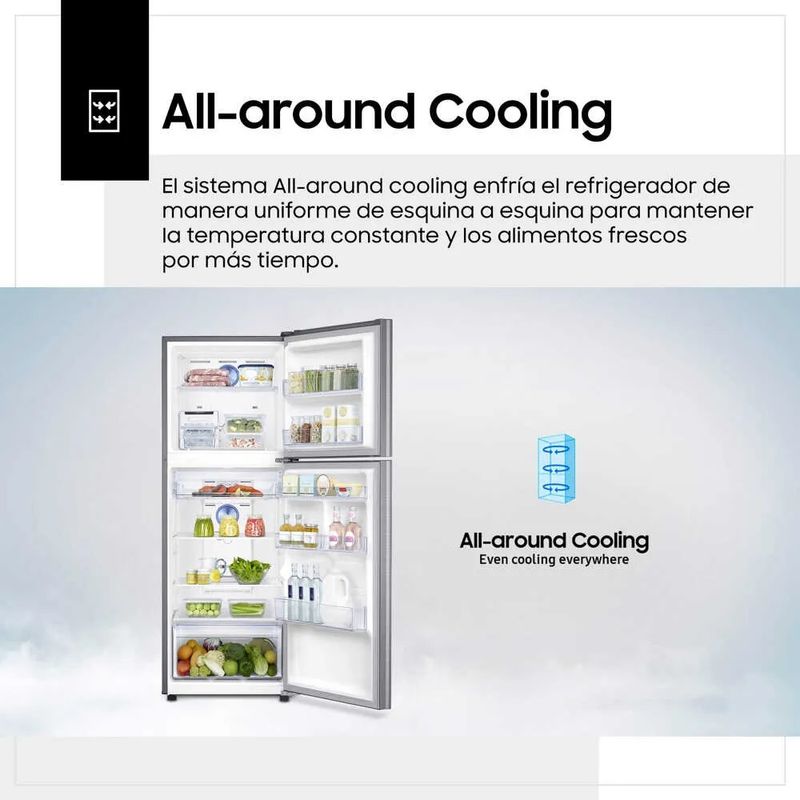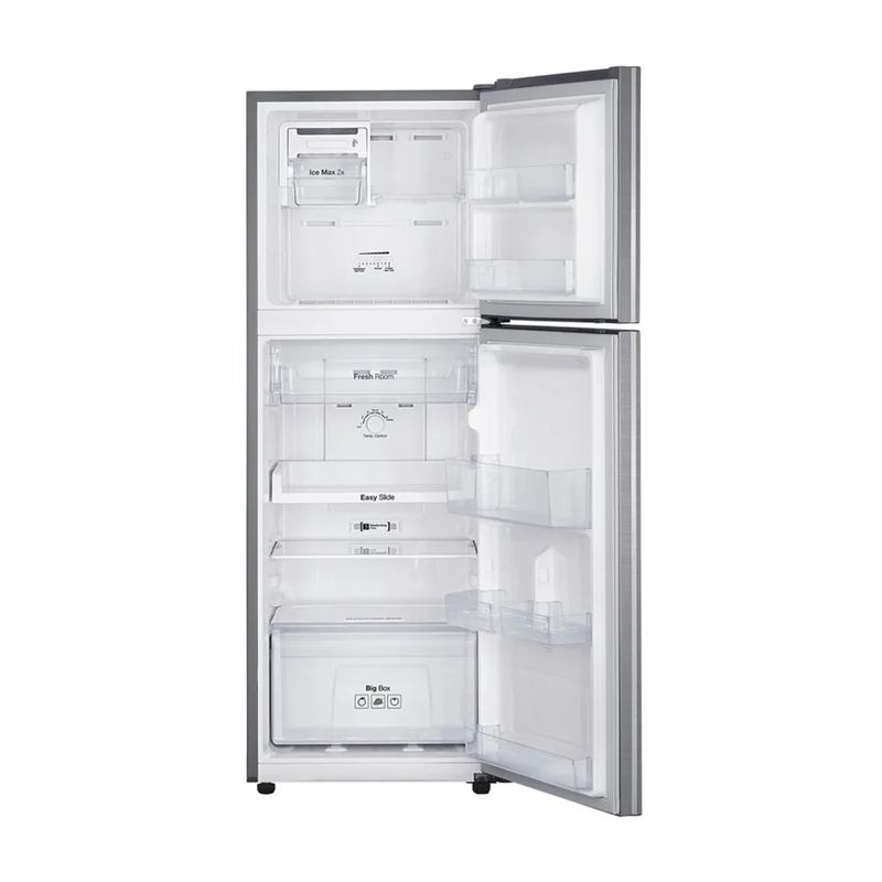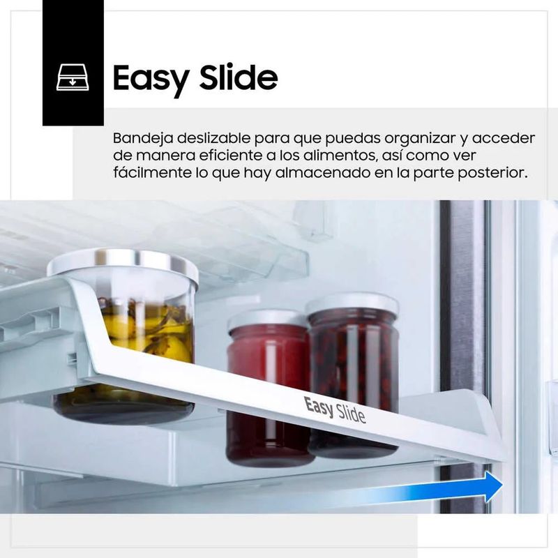 Disfrutar de una comida hecha a base de alimentos frescos siempre es esperado por todos en casa. Con la Refrigeradora RT22FARADS8 de la marca Samsung tendrás tus frutas y verduras en muy buenas condiciones para consumirlas cuando quieras. La Refrigeradora RT22FARADS8 tiene una capacidad de 234 litros para que conserves aquellos productos que sean de tu preferencia. Tendrás la opción de guardarlos y acomodarlos adecuadamente, gracias a que esta refrigeradora cuenta con bandejas de vidrio templado, anaqueles ajustables en puerta y la bandeja Easy Slide. Multiflow es el moderno sistema de enfriamiento que los expertos de Samsung integraron en esta refrigeradora, el cual permite que la temperatura se mantenga constante y uniforme para que tus alimentos como frutas, verduras, carnes y envasados estén frescos. Posee también el Moist Fresh Zone y Fresh Room para rápido enfriamiento. El Twist Ice Maker ha sido desarrollado para obtener cubos de hielo que enfríen tus bebidas y refrescos. Esta Refrigeradora RT22FARADS8 es No Frost y presenta un diseño con iluminación LED que contribuye a visualizar mejor todos los alimentos contenidos en el interior, así los elegirás con más rapidez. Por si fuera poco, esta Refrigeradora RT22FARADS8 fue elaborada incorporando el Compresor Digital Inverter y el refrigerante ecológico R-600. Además, la función de desodorizador hace que la refrigeradora esté libre de olores.