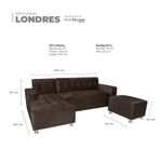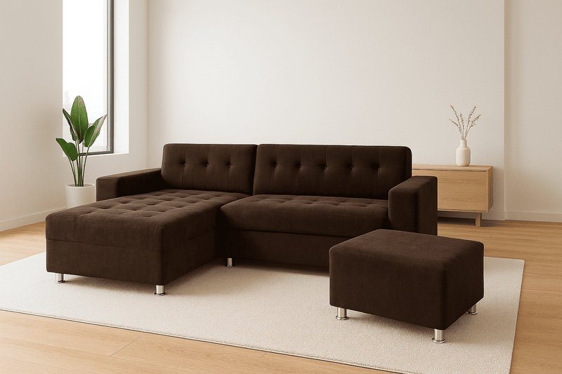 El Sofá Seccional Londres es la definición de comodidad moderna con un toque de sofisticación. Su robusta estructura, tapizada en un rico color Marrón Chocolate, lo convierte en el punto focal ideal para cualquier sala. Este conjunto incluye una Chaiselongue para el descanso y una Banqueta independiente para una funcionalidad superior. El detalle de capitoné (botones) en el respaldo no solo añade una textura visualmente atractiva, sino que también refuerza la estructura del cojín.
