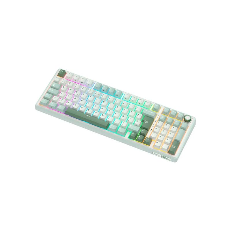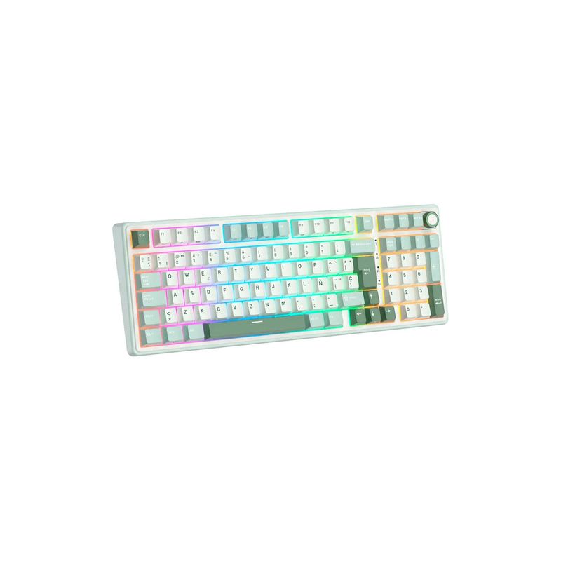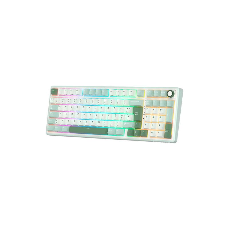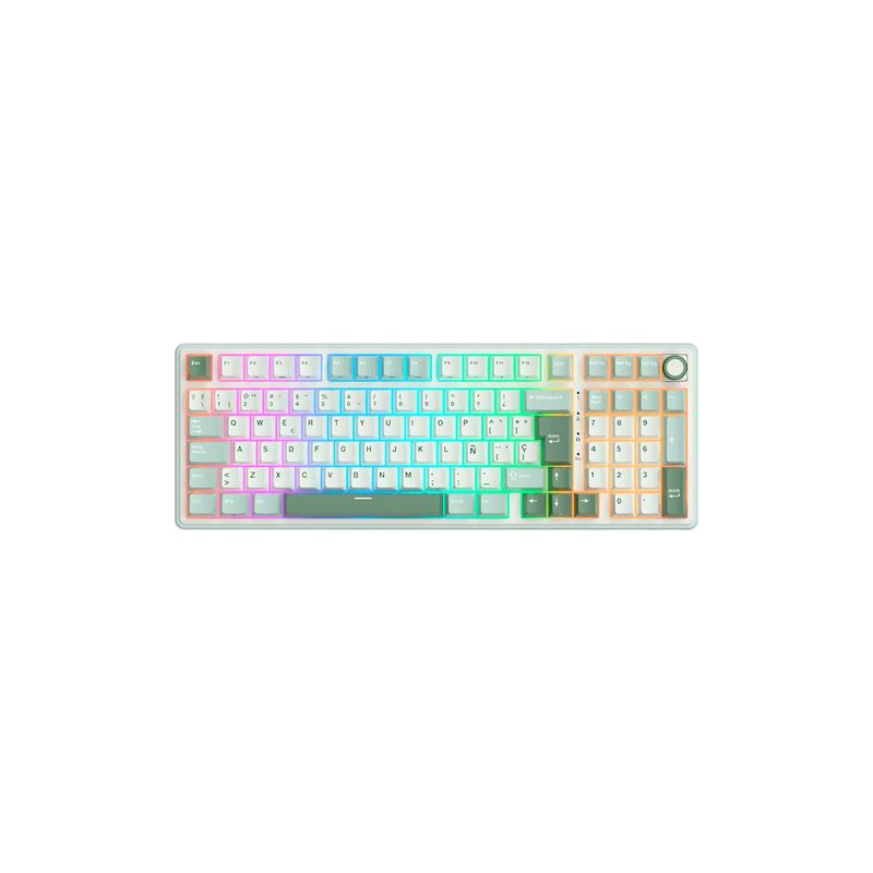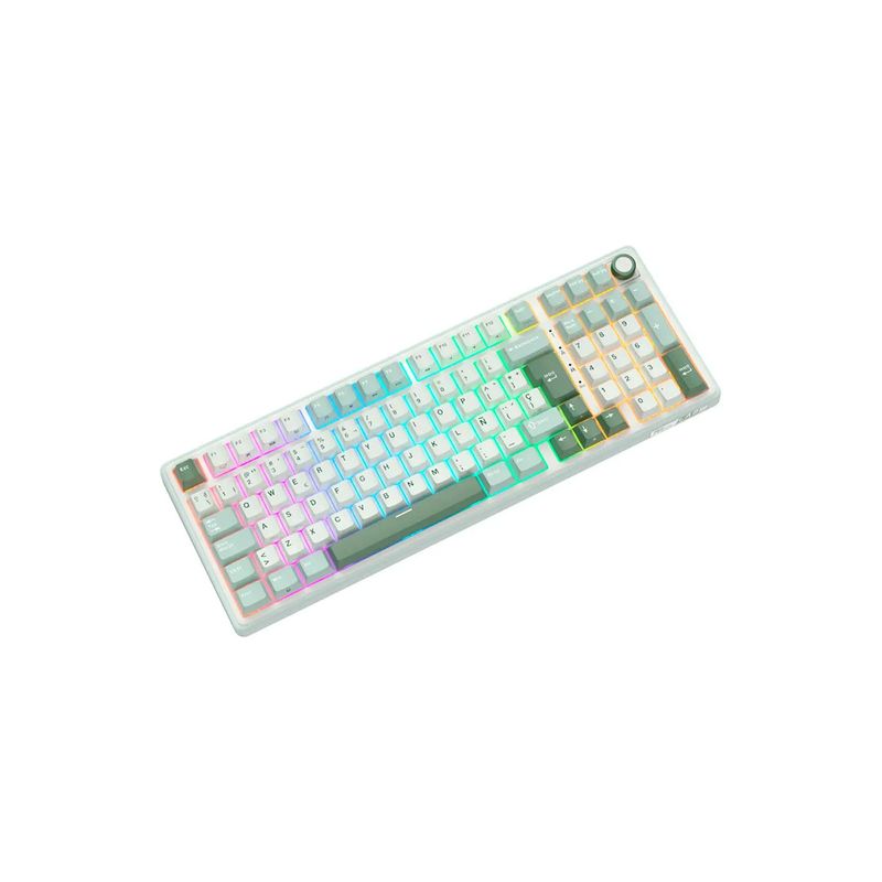 Las keycaps son de plástico PBT de doble inyección en tonos cyan y