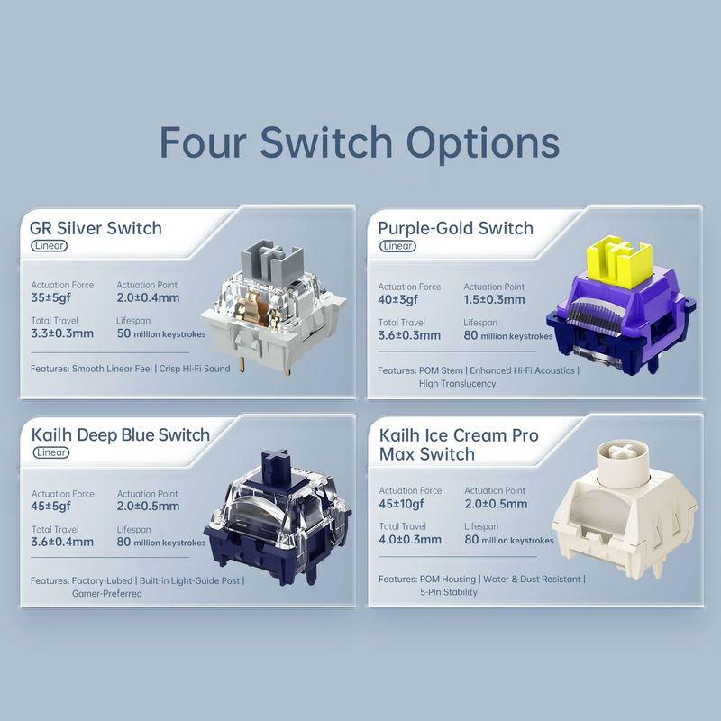 Incorpora interruptores lineales prelubricados que ofrecen un recorrido suave y silencioso, ideales para entornos compartidos. La placa es compatible con hot-swapp (3-pin) para personalizar o cambiar switches fácilmente.