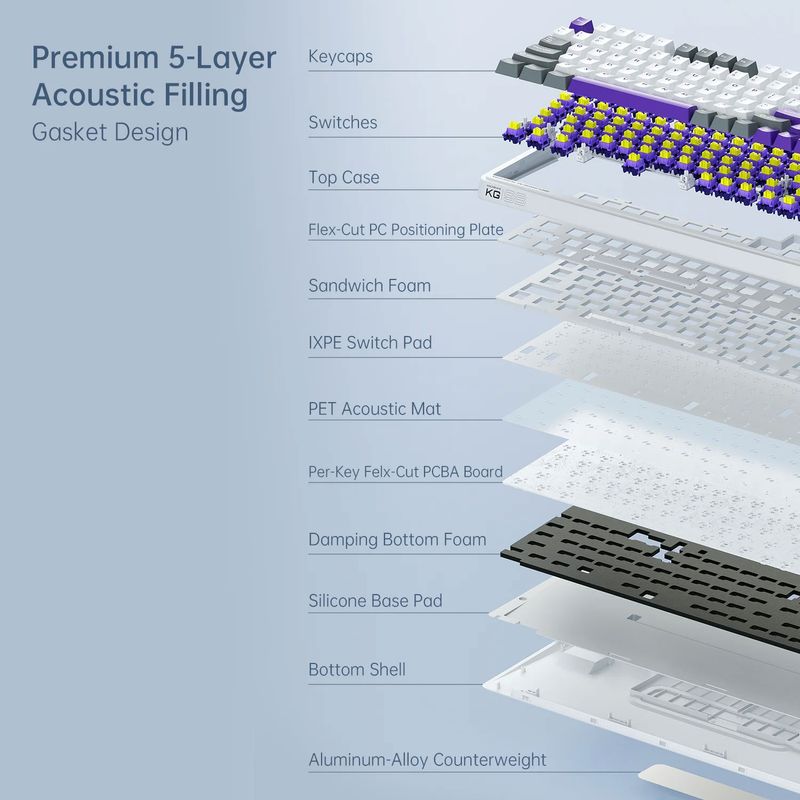 Retroiluminación RGB por tecla con efectos dinámicos controlables mediante software o atajos. Las keycaps son de ABS de doble inyección en color morado, resistentes al desgaste del uso.