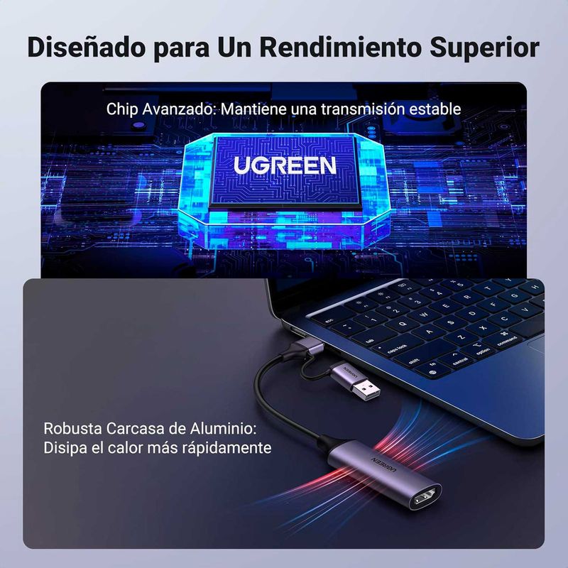 Tarjeta de captura real de 1080P 60FPS: la tarjeta de captura HDMI UGREEN soporta una resolución máxima de entrada de hasta 4K @30Hz, resolución máxima de salida de hasta 1080P @60Hz. Esta tarjeta de captura conecta cámaras, videocámaras y otras fuentes de señal de audio y video a través de la interfaz HDMI, y captura señales HDMI para grabar en dispositivos USB A o USB C. Es ideal para grabar videos y audio claramente en cualquier momento para transmitir