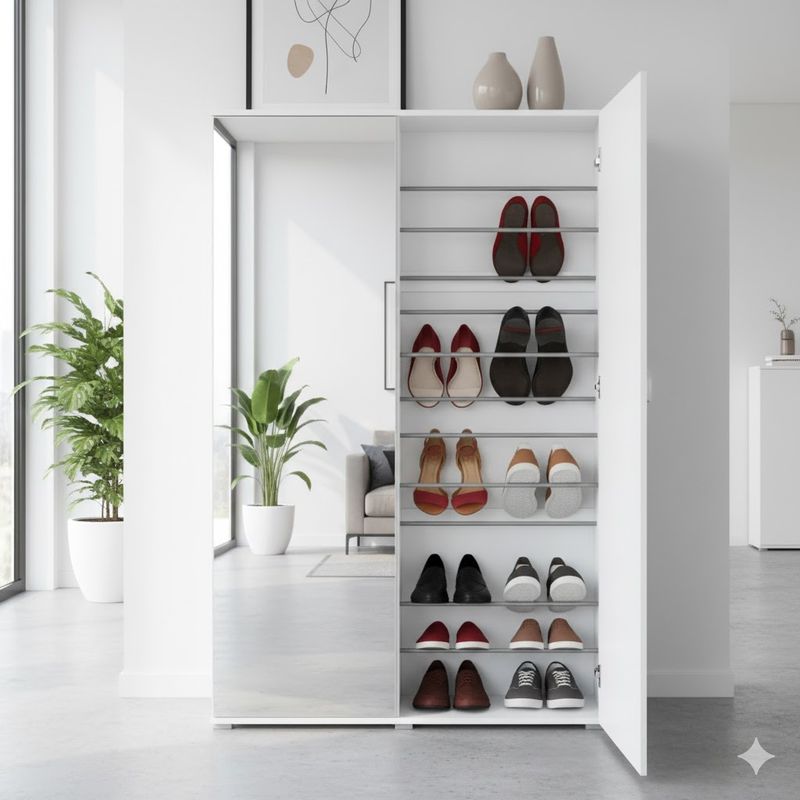 La Zapatera Cronos es la inversión definitiva para quienes buscan maximizar el espacio, combinando el almacenamiento masivo con la utilidad indispensable de un espejo grande.